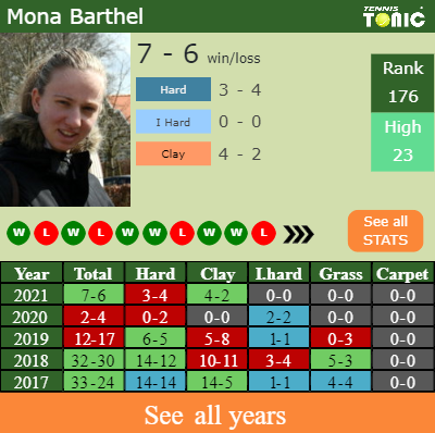 In terms of her career, Mona has an overall 348-268 record. She has a positive 105-81 record on clay.