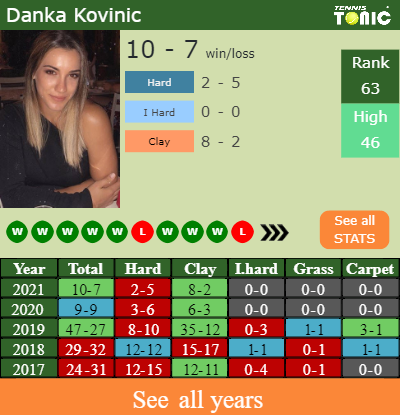 Kovinic has a 10-7 win-loss record in 2021, 8-2 on clay (See FULL STATS).