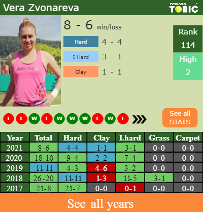 Zvonareva has a 8-6 win-loss record in 2021, 1-1 on clay (See FULL STATS).