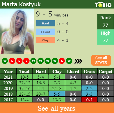 Kostyuk has a 10-5 win-loss record in 2021, 5-1 on clay (See FULL STATS).