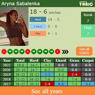 Aryna has a 18-6 win-loss record in 2021, 4-1 on clay (See FULL STATS).
