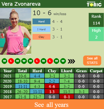 Zvonareva has a 10-6 win-loss record in 2021, 3-1 on clay (See FULL STATS).