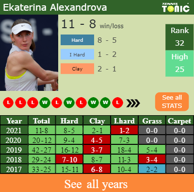 Ekaterina has a 11-8 win-loss record in 2021, 2-1 on clay (See FULL STATS).