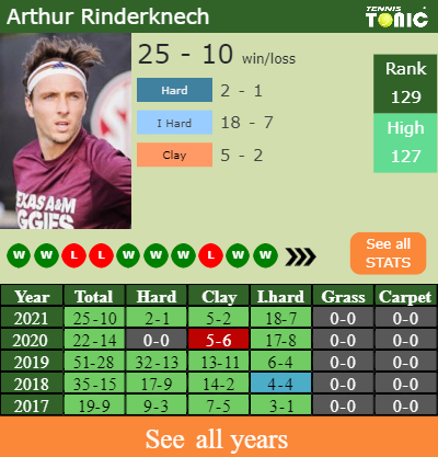 Rinderknech has a 25-10 win-loss record in 2021, 5-2 on clay (See FULL STATS).
