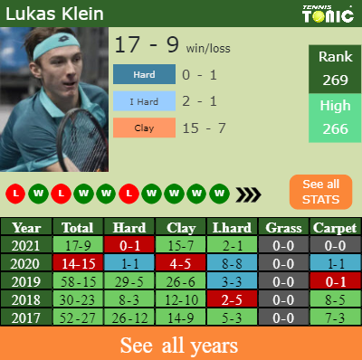 This will be the 2nd time that Arthur Rinderknech and Lukas Klein face off. The head to head is 1-0 for Klein (see full H2H stats), but they have never played each other on clay.