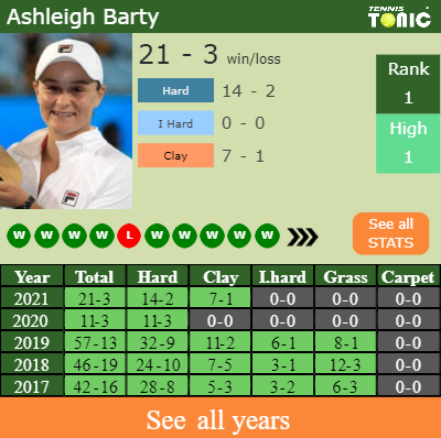 Barty has a fantastic match record in the last 10 years having won 74% of her matches (264-91). 7-1 on clay in 2021. Regarding her performance on the same surface of this event, Barty has a 52-23 match record in the last years on clay.