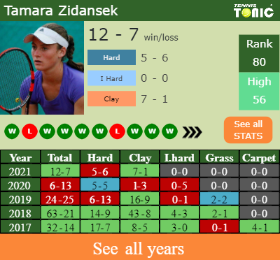 Zidansek has a 12-7 win-loss record in 2021, 7-1 on clay (See FULL STATS).