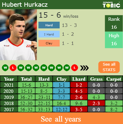 The Pole has a 15-6 win-loss record in 2021, 1-1 on clay (See FULL STATS).