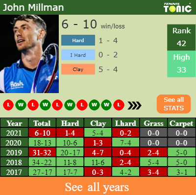 Millman has a 6-10 win-loss record in 2021, 5-4 on clay (See FULL STATS).