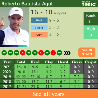 Bautista-Agut has a solid record in the last 10 years having won 65% of his matches (381-206). 4-2 on clay in 2021. Regarding his performance on the same surface of this tournament, Bautista-Agut has a 101-63 match record in the last years on clay.