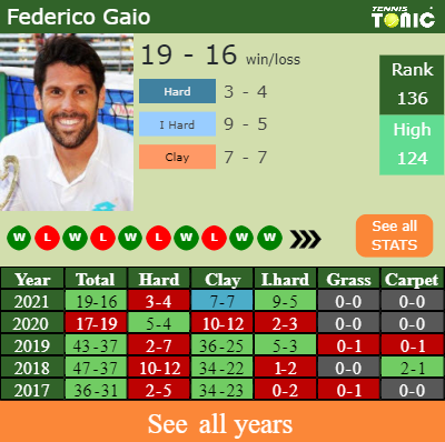 Gaio has a favorable match record in the last 10 years having won 56% of his matches (365-284). 7-7 on clay in 2021. Regarding his performance on the same surface of this competition, Gaio has a 261-179 record in the last years on clay.