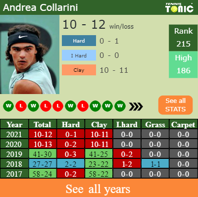 Collarini has a solid match record in the last 10 years having won 61% of his matches (357-226). 10-11 on clay in 2021. In connection with his performance on the same surface of this event, Collarini has a 343-200 win-loss record in the last years on clay.