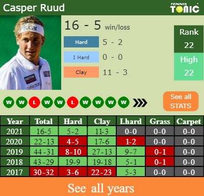 Ruud has a 16-5 win-loss record in 2021, 11-3 on clay (See FULL STATS).