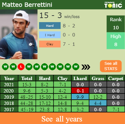 Berrettini has a solid win-loss record in the last 8 years having won 66% of his matches (226-119). 7-1 on clay in 2021. Regarding his performance on the same surface of this event, Berrettini has a 71-36 record in the last 8 years on clay.