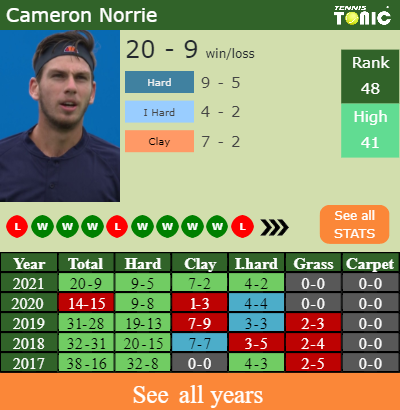 The Brit has a 20-9 win-loss record in 2021, 7-2 on clay (See FULL STATS).
