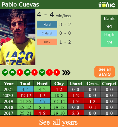 Cuevas has a 4-4 win-loss record in 2021, 1-2 on clay (See FULL STATS).