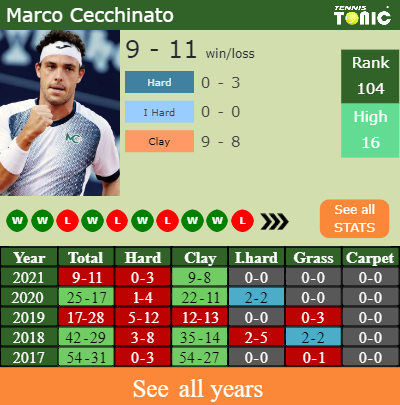 In terms of his career, Cecchinato has an overall 360-246 record. He has a positive 321-171 record on clay.