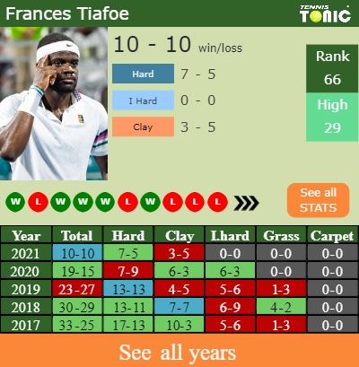 The American has a 10-10 win-loss record in 2021, 3-5 on clay (See FULL STATS).
