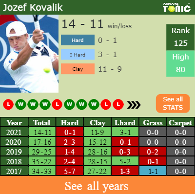 Kovalik has a 14-11 win-loss record in 2021, 11-9 on clay (See FULL STATS).