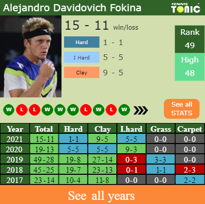 Davidovich Fokina has a 15-11 win-loss record in 2021, 9-5 on clay (See FULL STATS).