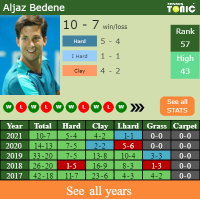 Aljaz has a 10-7 win-loss record in 2021, 4-2 on clay (See FULL STATS).