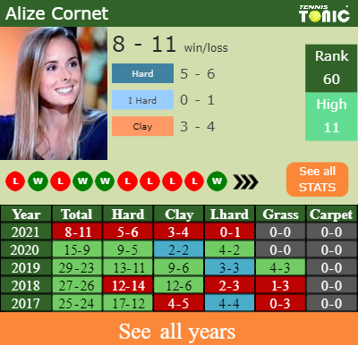 Cornet has a 8-11 win-loss record in 2021, 3-4 on clay (See FULL STATS).