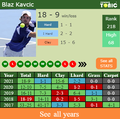 The Slovenian has a 18-9 win-loss record in 2021, 15-6 on clay (See FULL STATS).