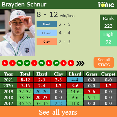 Schnur has a 8-12 win-loss record in 2021, 2-3 on clay (See FULL STATS).