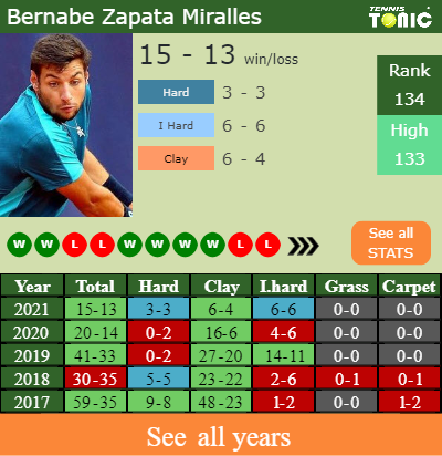 Zapata Miralles has a 15-13 win-loss record in 2021, 6-4 on clay (See FULL STATS).