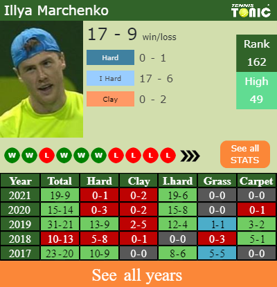 Marchenko has a 19-9 win-loss record in 2021, 0-2 on clay (See FULL STATS).