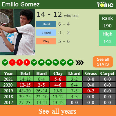 Gomez has a 14-12 win-loss record in 2021, 5-6 on clay (See FULL STATS).