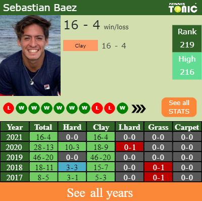 Baez has a 16-4 win-loss record in 2021, 16-4 on clay (See FULL STATS).