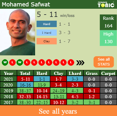 Safwat has a 5-11 win-loss record in 2021, 1-7 on clay (See FULL STATS).