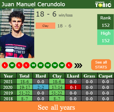 Juan has a 18-6 win-loss record in 2021, 18-6 on clay (See FULL STATS).