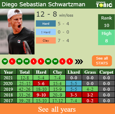 Schwartzman has a 12-8 win-loss record in 2021, 7-4 on clay (See FULL STATS).