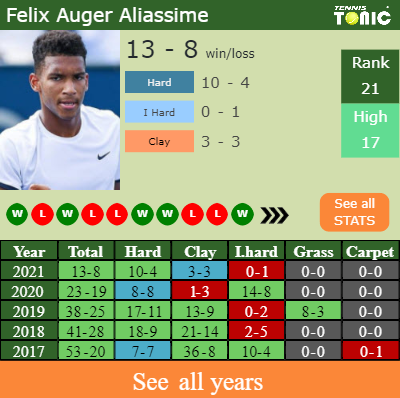 Auger-Aliassime has a 13-8 win-loss record in 2021, 3-3 on clay (See FULL STATS).
