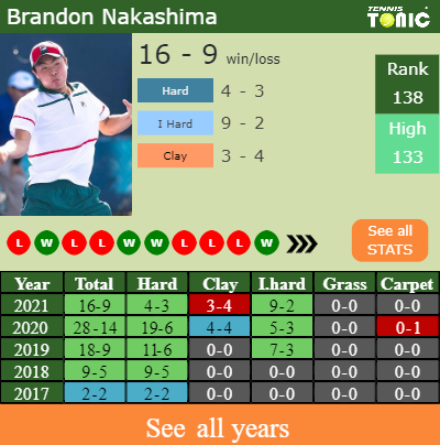 Nakashima has a 16-9 win-loss record in 2021, 3-4 on clay (See FULL STATS).
