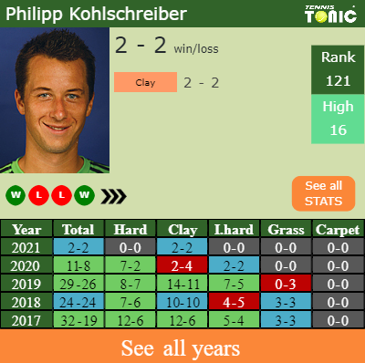Kohlschreiber has a good record in the last 10 years having won 58% of his matches (273-199). 2-2 on clay in 2021. Regarding his performance on the same surface of this tournament, Kohlschreiber has a 110-72 match record in the last years on clay.