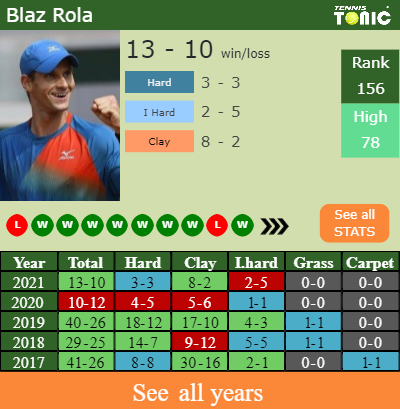 Rola has a 13-10 win-loss record in 2021, 8-2 on clay (See FULL STATS).