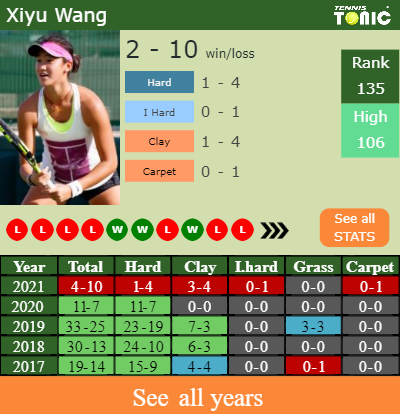 Xiyu has a 4-10 win-loss record in 2021, 3-4 on clay (See FULL STATS).