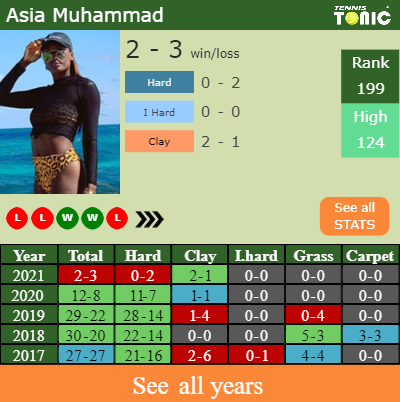 In terms of her career, Muhammad has an overall 262-222 record. She has a negative 49-56 record on clay.