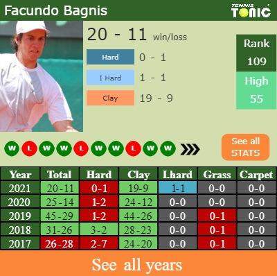Bagnis has a composed 20-11 win-loss record in 2021, 19-9 on clay (See FULL STATS).