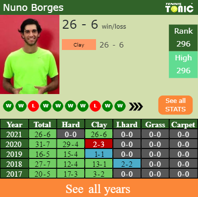 Nuno has a composed 26-6 win-loss record in 2021, 26-6 on clay (See FULL STATS).