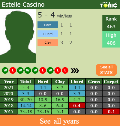 Cascino has an overall 5-4 win-loss record in 2021, 3-2 on clay (See FULL STATS).