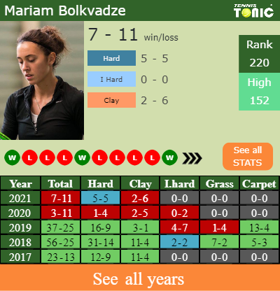 Bolkvadze has a composed 7-11 win-loss record in 2021, 2-6 on clay (See FULL STATS).