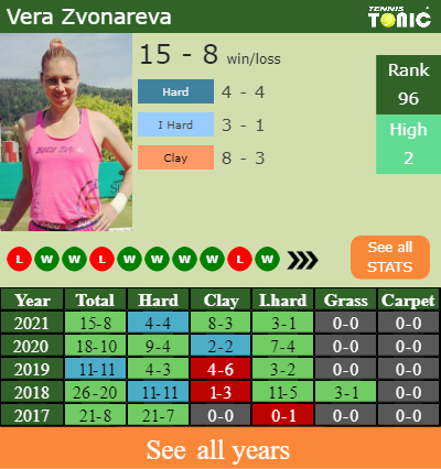 Zvonareva has a positive record in the last 10 years having won 59% of her matches (114-79). 8-3 on clay in 2021. Talking about her performance on the same surface of this competition, Zvonareva has a compiled 17-16 match record in the last years on clay.