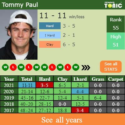 Paul has a solid win-loss record in the last 7 years having won 64% of his matches (243-137). 6-5 on clay in 2021. Regarding his performance on the same surface of this competition, Paul has a compiled90-41 win-loss record in the last 7 years on clay.