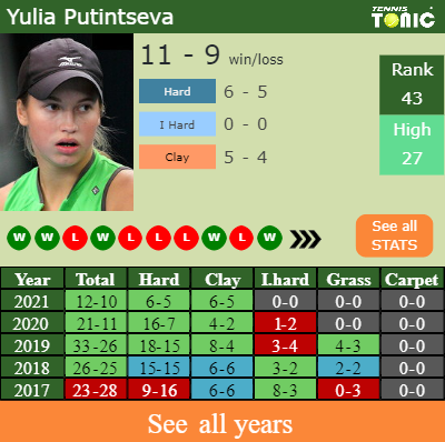 Putintseva has a composed 12-10 win-loss record in 2021, 6-5 on clay (See FULL STATS).