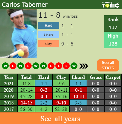 Taberner has a solid record in the last 7 years having won 66% of his matches (272-143). 9-6 on clay in 2021. Talking about his performance on the same surface of this competition, Taberner has an overall240-114 match record in the last 7 years on clay.