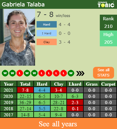 Talaba has a composed 7-8 win-loss record in 2021, 3-4 on clay (See FULL STATS).
